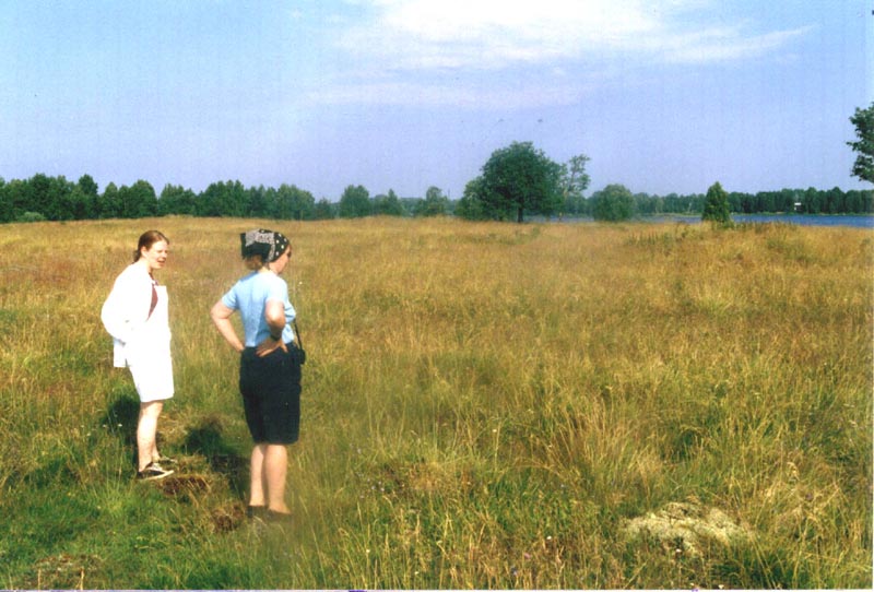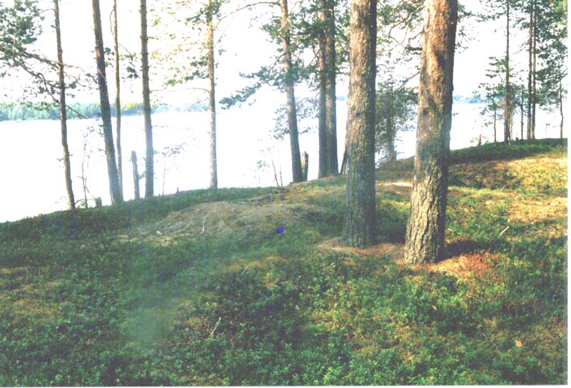 | Lietsaaren - Repolan vanhan kalmismuan maisemaa. Etualalla vanhoja hautakumpuja, taustalla vasemmalla Saviniemi ja oikealla Repolan pogosta. |