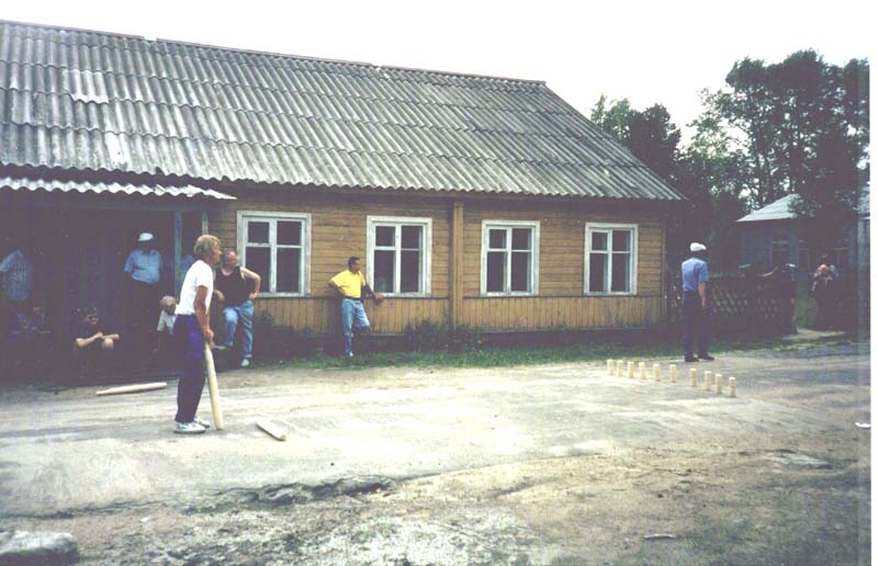 | Pojat pelasivat kyykkää. Repolan koulun voimistelun opettaja heittovuorossa. Takana kannustajien joukko. |